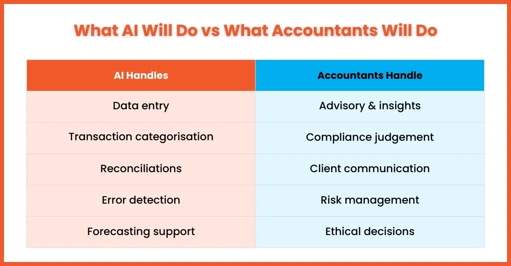 Not at all; AI will only take over recurring accounting tasks, while the responsibility for compliance, judgment-making, and maintaining client relationships will remain the accountant’s domain.
