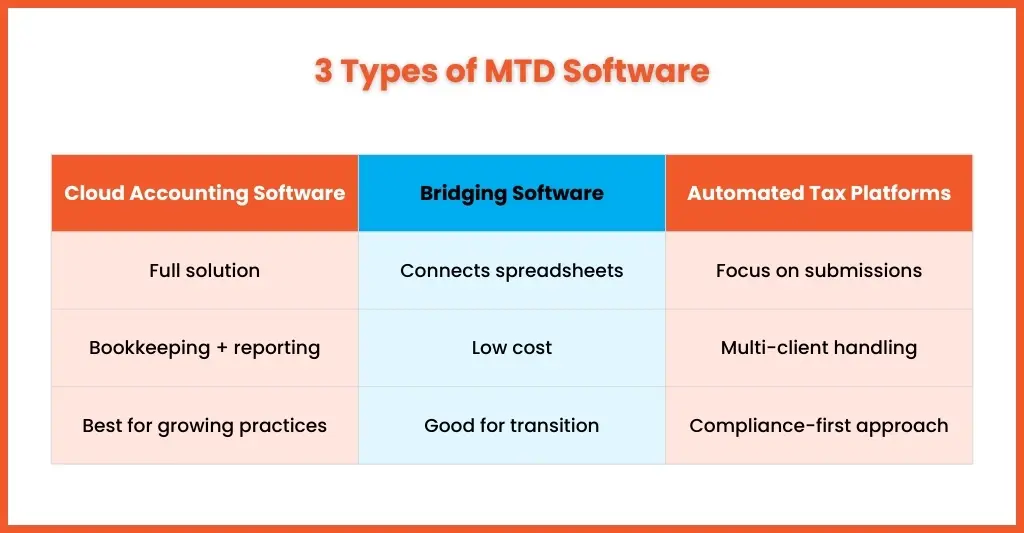 Three main types of HMRC approved Making Tax Digital software suit different practice needs, all enabling digital records quarterly updates, and ITSA (Income Tax Self Assessment) submissions.