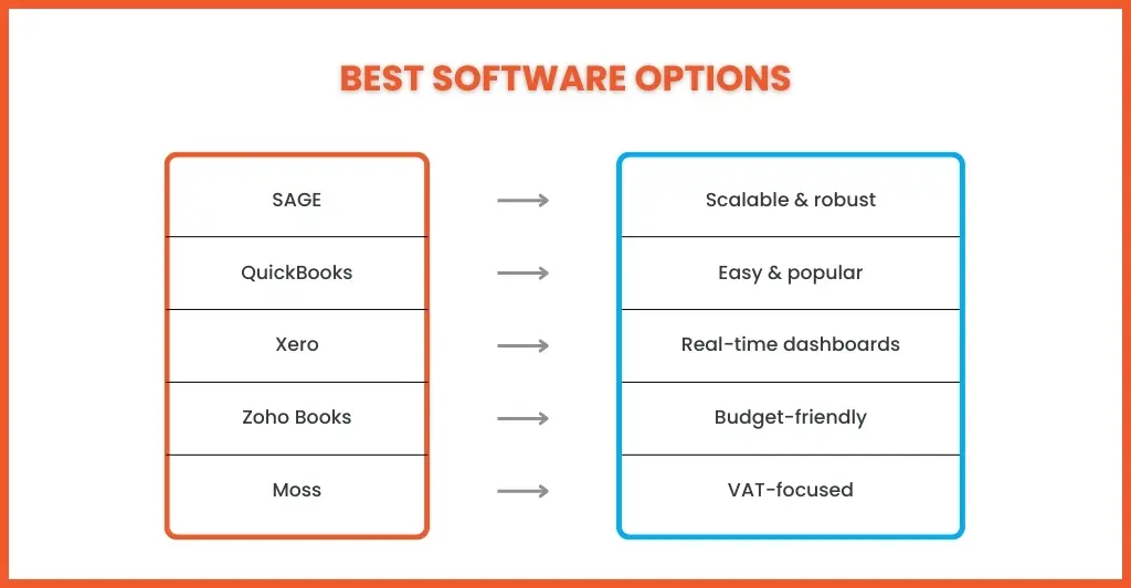 The main HMRC–approved software includes Sage, QuickBooks, Xero, Zoho Books, and Moss. These support the Making Tax Digital software for record-keeping, automated submissions and account management.
